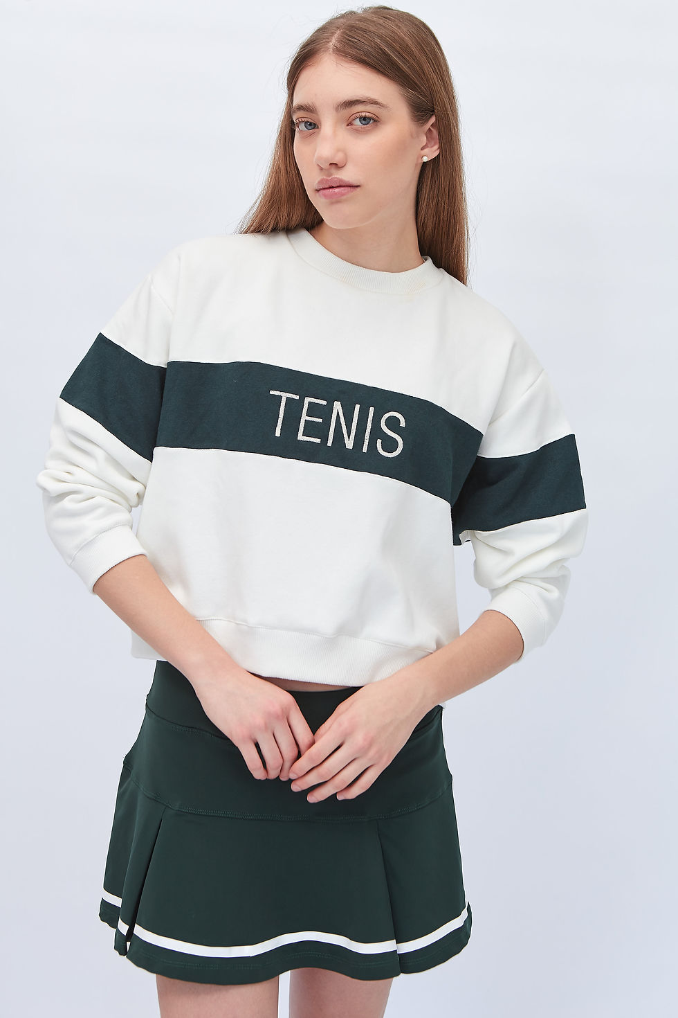 Pollera de tenis verde inglés con guarda blanca sublimada.